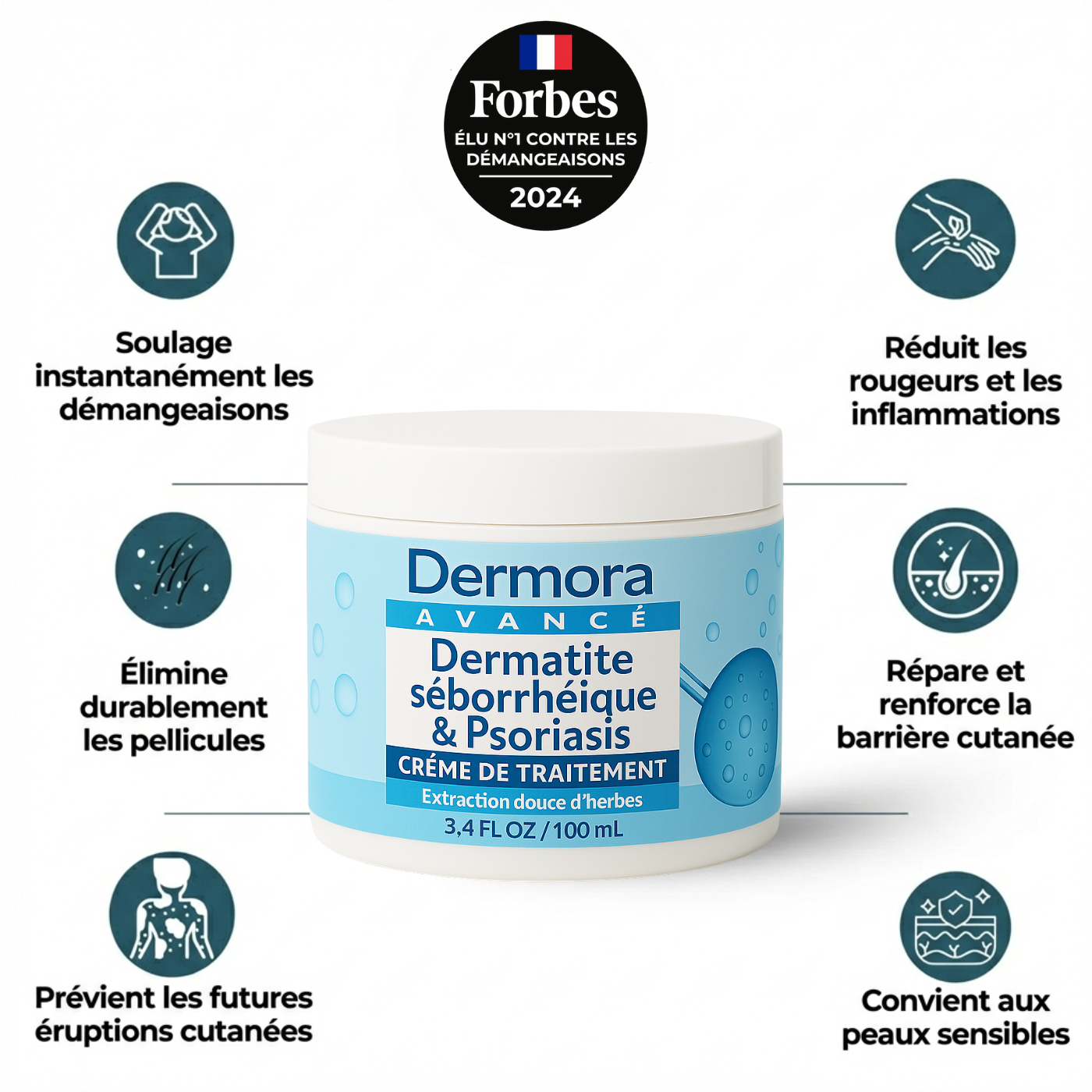 "La crème Dermora apaise efficacement le psoriasis et la dermatite séborrhéique. Sa formule naturelle calme l’inflammation et favorise la régénération cutanée"